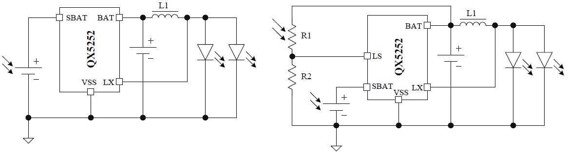 QX5252由开关型驱动电路、光控开关电路、过放保护电路、内部集成的肖特基二极管等电路组成。